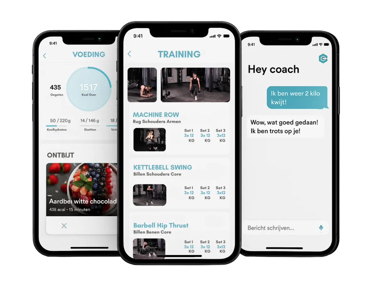 In onze handige app vind je jouw persoonlijke schema met uitlegvideo's, tekst, het bijhouden van je gewichten en reps. Samen kijken we naar hoe het gaat en passen we aan waar nodig.